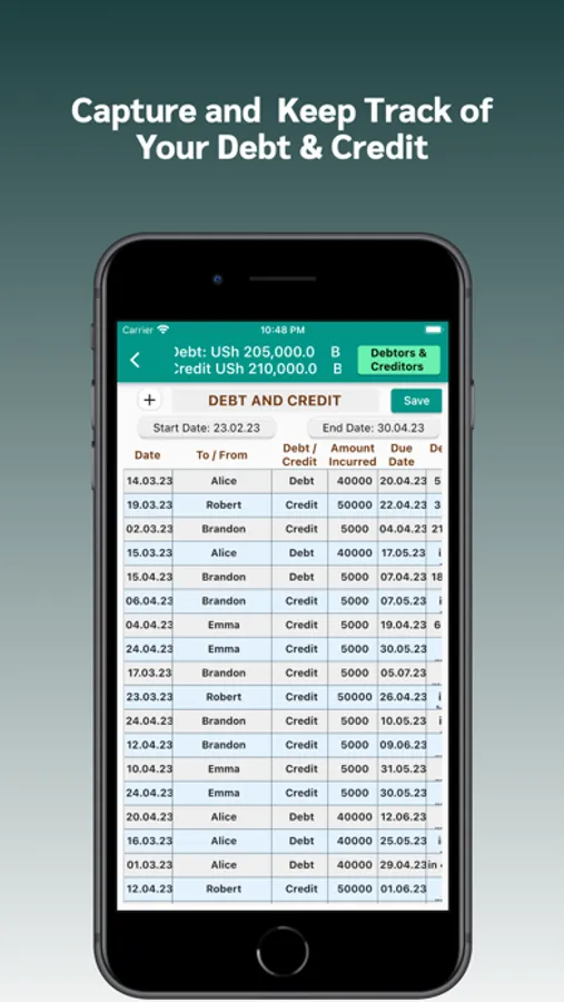 This section is for managing your debts and credit. Entries are made on a single sheet yet they are distinguished and