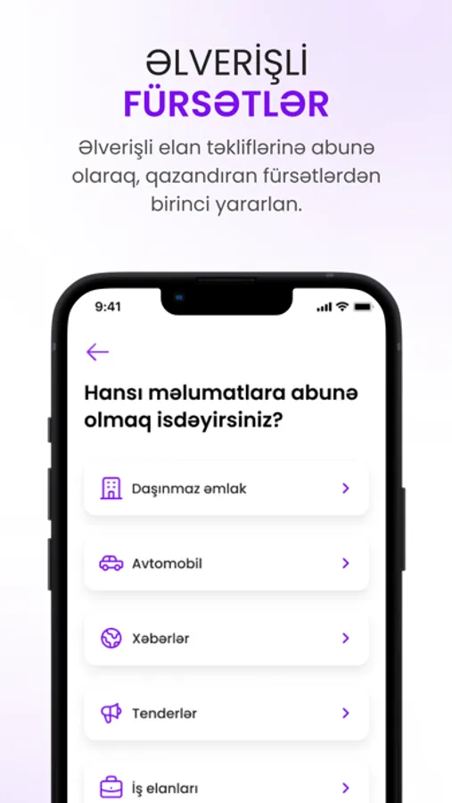 Daşınmaz əmlak, nəqliyyat, tender, iş elanları və xəbərlərə seçdiyiniz meyarlar üzrə