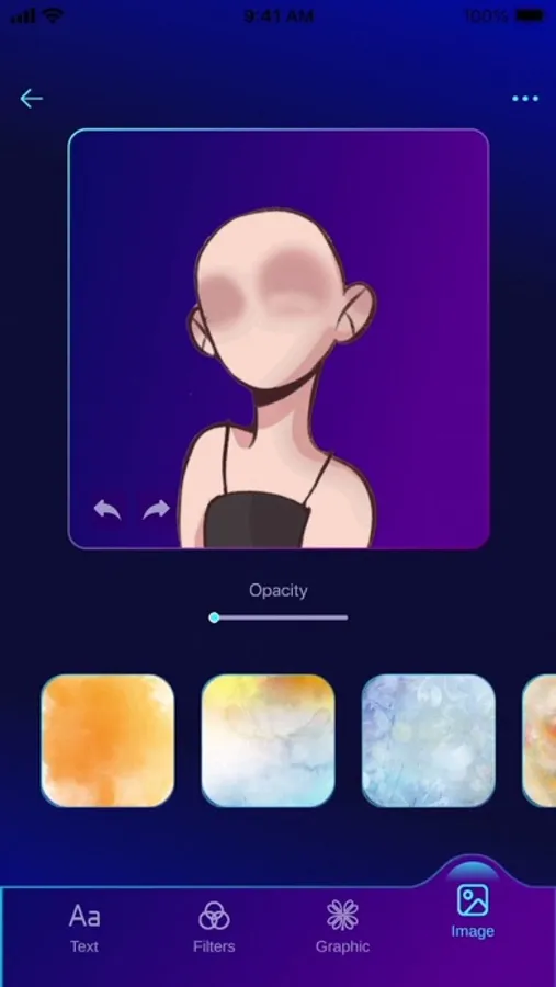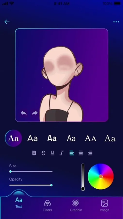 Use unique backgrounds to take your character somewhere new! Send it to any city in the world, deep space, or add it to a picture of famous artists. Add text to your art by choosing the most suitable font from a huge collection. Already interested? So download the application right now and let your creativity run wild!