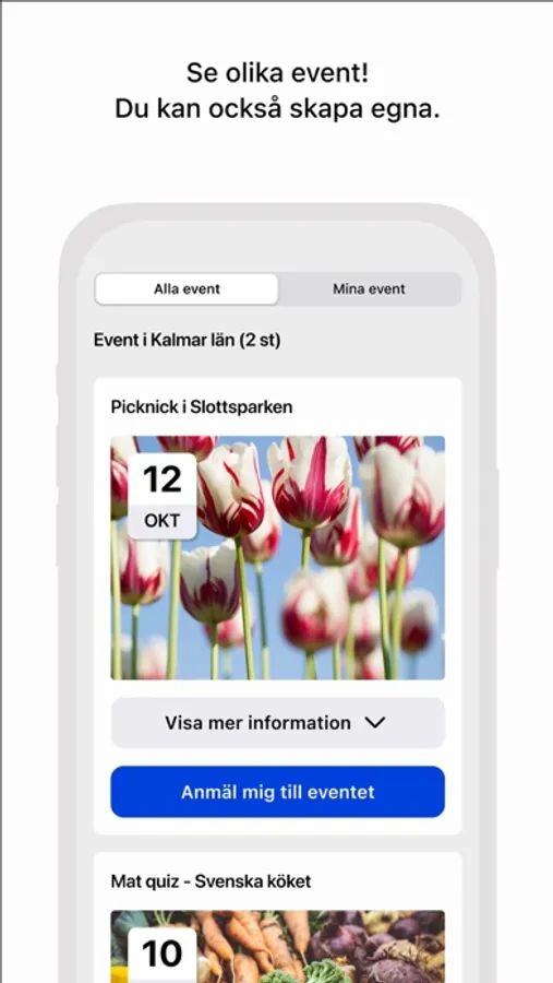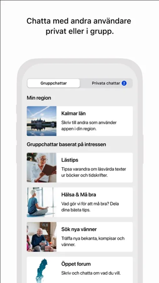 Med hjälp av appen kan du samtala, chatta och knyta kontakter. Du får också tips och information om aktiviteter och arrangemang för att möta andra.