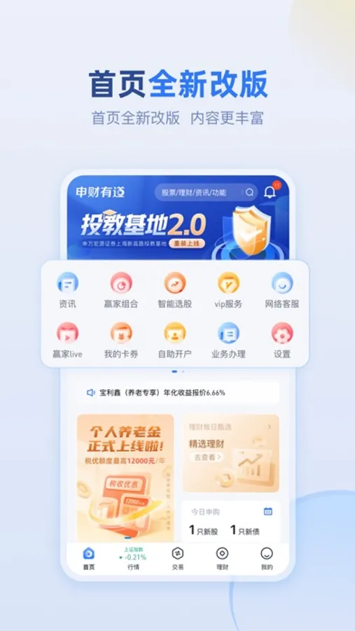 申财有道APP是申万宏源证券为广大投资者全新打造的一款集开户与业务办理、特色行情、智能交易、智能资讯、投顾服务、基金与理财等功能于一体的新一代证券APP。申财有道APP在用户体验、数字化、智能化等方面进行了全新升级,为用户带来更便捷、更精细、更贴心的财富管理体验,助力用户“申财有道”。