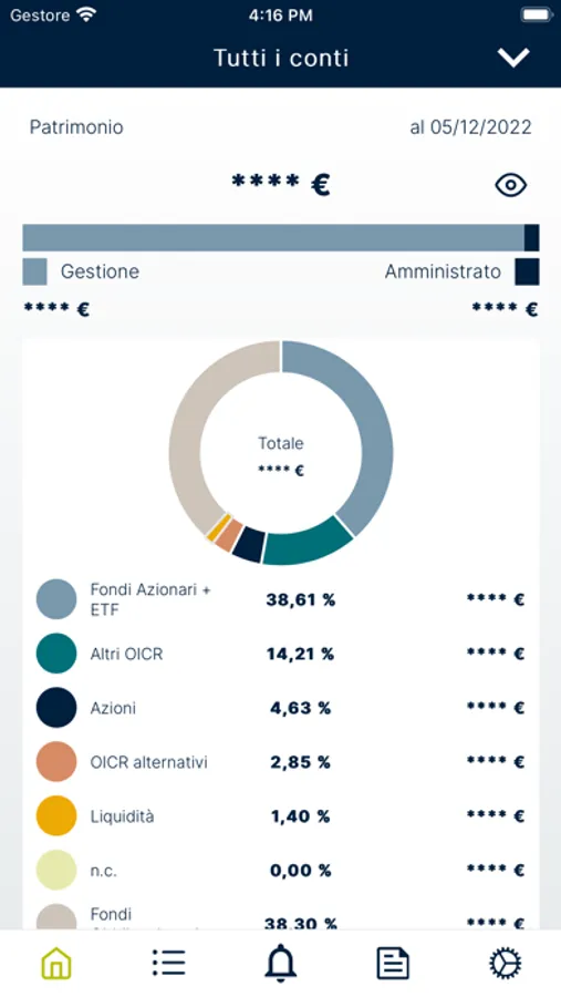Oltre alla fotografia del patrimonio complessivo, distinto tra servizio di Gestione Patrimoniale ed Amministrato, è possibile accedere ai singoli mandati e ai dettagli di portafoglio, ovvero asset class, titoli, liquidità, performance e alle relative movimentazioni.