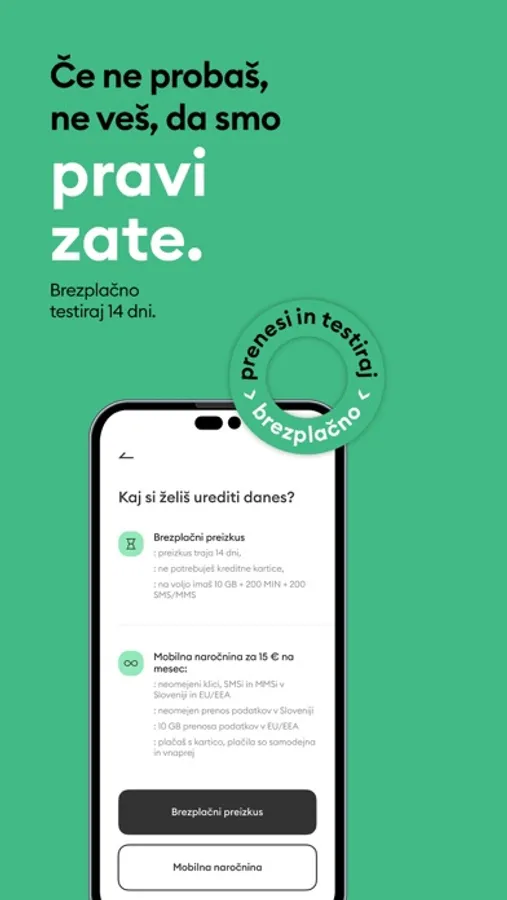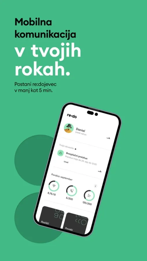 Ker zatrdno verjamemo, da če ne probaš, ne veš, lahko re:do 14 dni brezplačno testiraš. Preizkus je totalno brez obveznosti, saj ne potrebuješ kreditne kartice. Dobiš 10 GB prenosa podatkov, 200 MIN, 200 sporočil innn re:akcija!