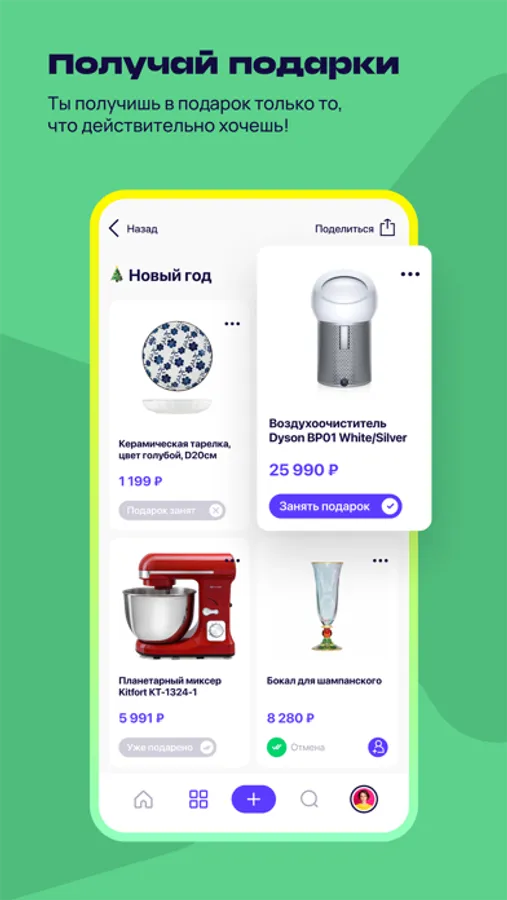 Бронируй подарки и дари вместе с друзьями. Любой подарок можно забронировать для покупки, чтобы точно не повторяться. А если хочется подарить что-то особенное всем вместе, используй кнопку «Совместный подарок».