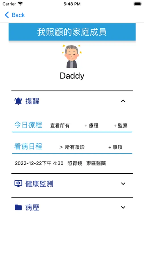 3. 日記及記錄:用戶可授權連結Apple健康程式,自動記錄個人健康訊息。也可以記錄長者病歷、曾使用藥物、健康監察資料、藥物敏感等,方便跟家庭醫生分享。