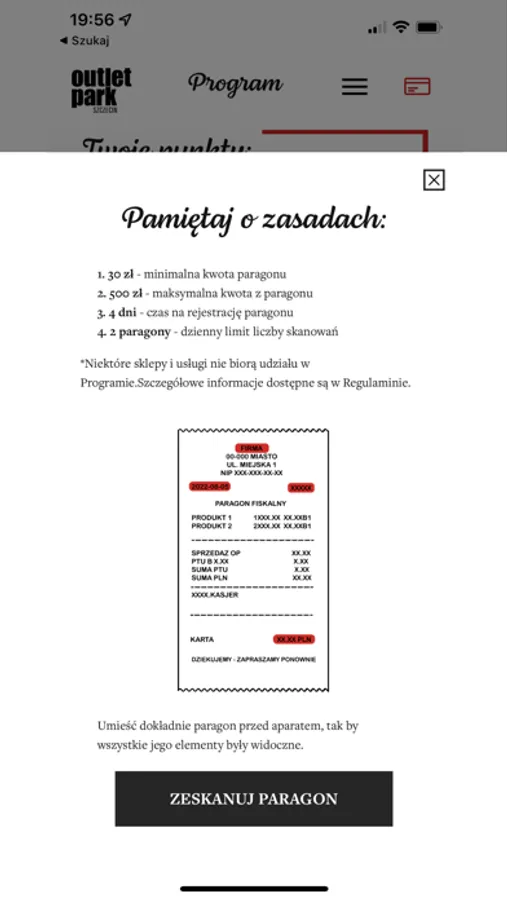 W aplikacji Outlet Park znajdziesz zakładkę oznaczoną gwiazdką, czyli stworzony z myślą o Tobie program lojalnościowy. Po skończonych zakupach wystarczy, że zeskanujesz swoje paragony naciskając na przycisk “Skanuj”. Wtedy na Twoje konto trafią punkty, które będziesz mógł wymienić na wybrane nagrody.