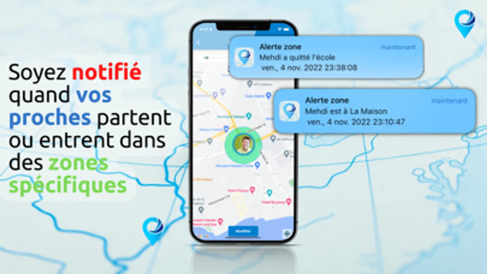 - Marquez des zones sur la carte et soyez notifié quand vos proches partent ou entrent dans des ces zones.