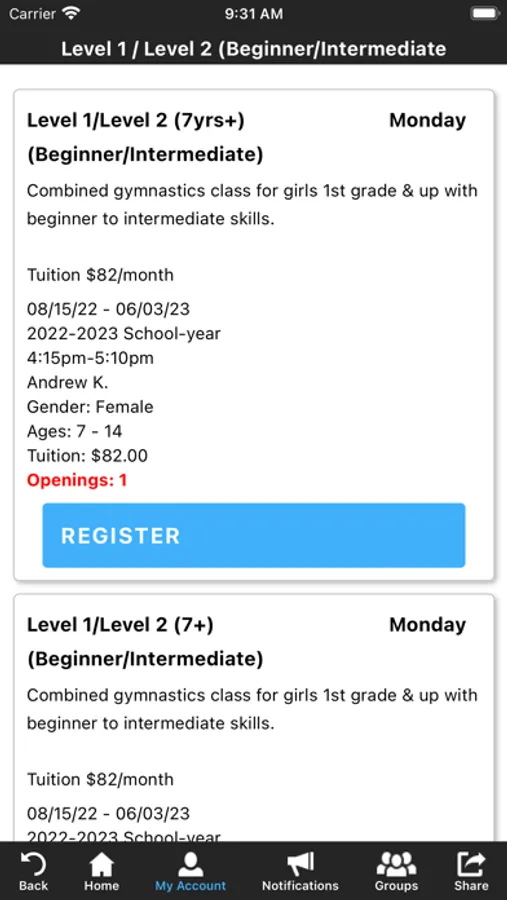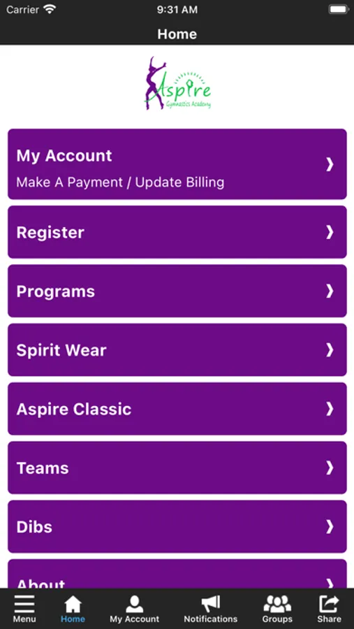 The Aspire Gymnastics Academy app allows you to manage your account with ease, register for classes, parties, and special events. You'll also receive important notifications about class changes, closings, registration openings, special announcements, and upcoming events.