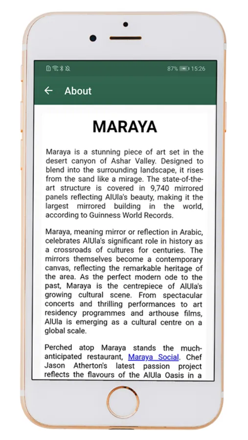 This mobile application is used to navigate inside Maraya Building facilities and events by giving directions on live map and supporting voice