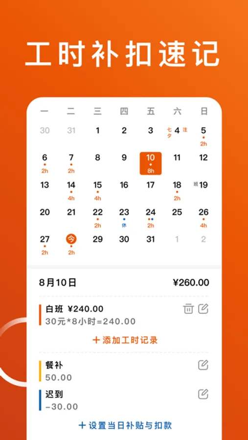 用户仅需要选择工作时长,即可立即算出当日工资,数据并保存在服务器,不丢失数据。