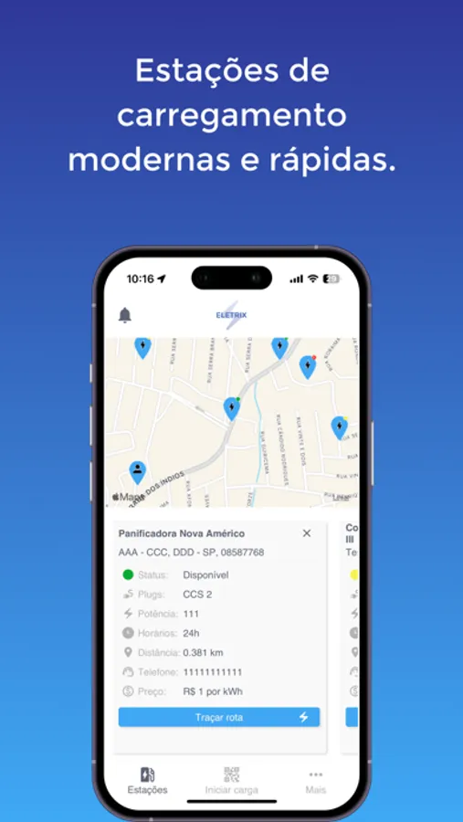 Com a Eletrix você encontra os melhores e mais potentes carregadores de carros elétricos. Consulte as especificações de cada carregador e trace uma rota até ele com apenas um click.