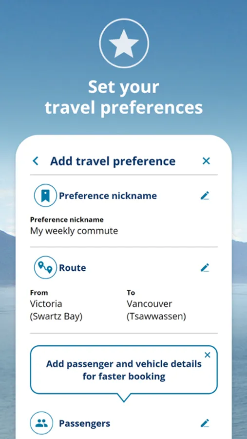 Get quick access to schedules, current conditions and a faster booking experience on your frequently travelled routes by setting up travel preferences. Give your travel preferences nicknames, set departure and arrival terminals and add passenger and vehicle details on bookable routes.