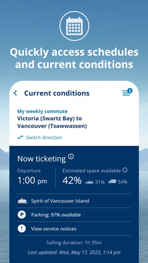 Route sailing status and estimated deck space are now easier to check with the updated Current Conditions layout. Travel preferences make it easier to find your frequently traveled routes, check which sailing is being ticketed, and view status of upcoming sailings.