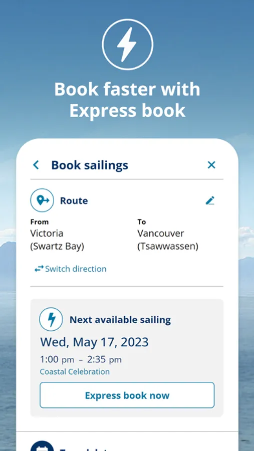 Make your booking experience easier with personalized travel preferences. Quickly jump to the next available sailing with the new Express book feature, and change or cancel existing bookings on-the-go.
