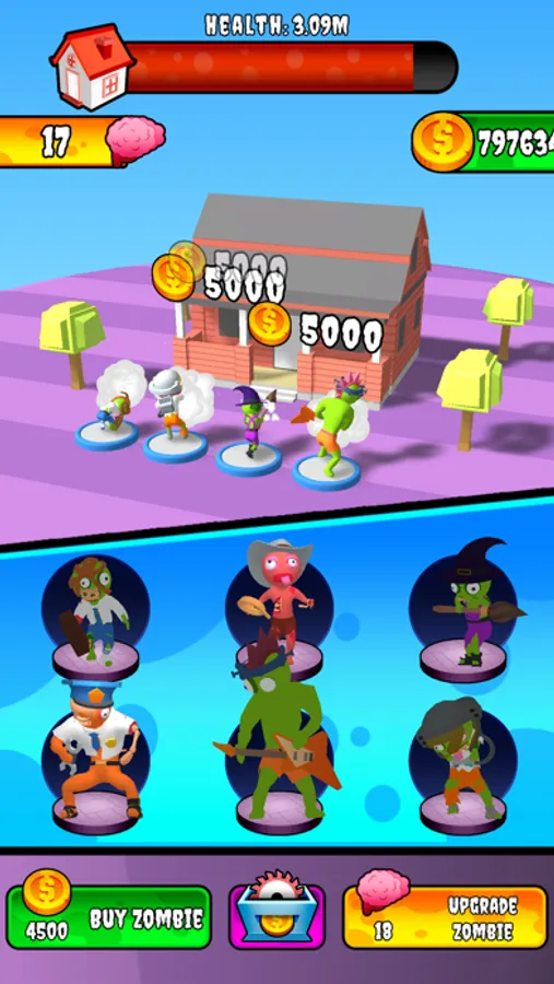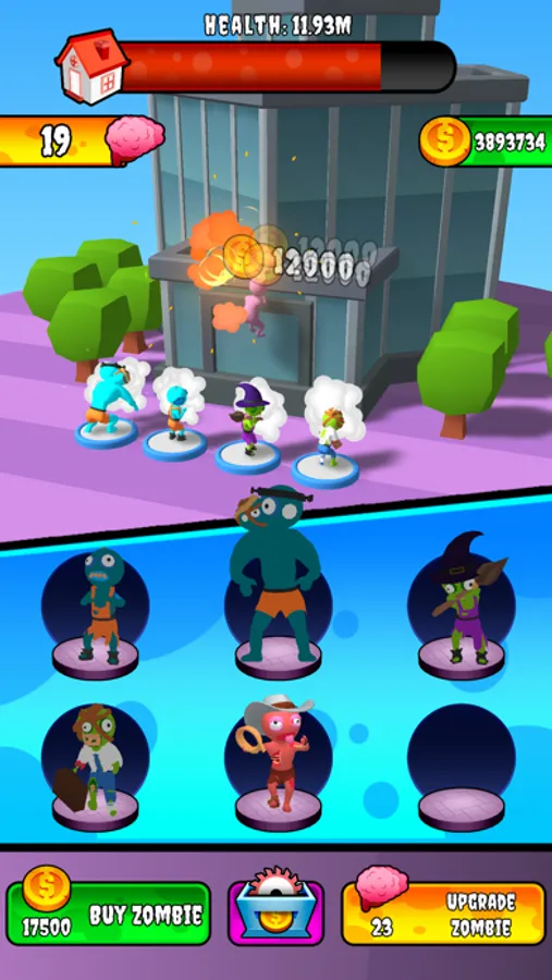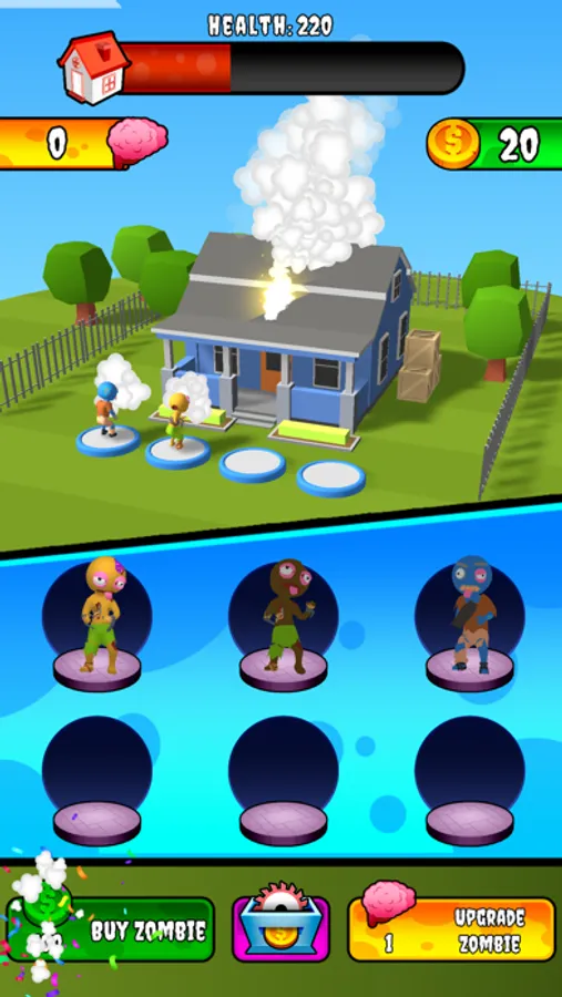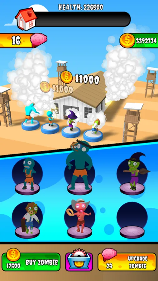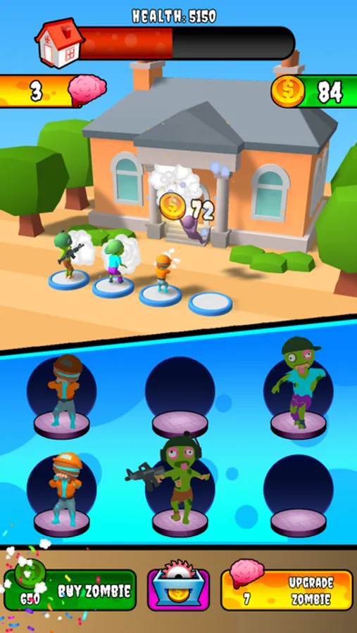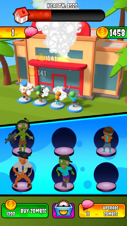 Merge your zombies together to create more powerful units. Attack the buildings to earn brains and money, and use both of them to add new zombies to your horde.