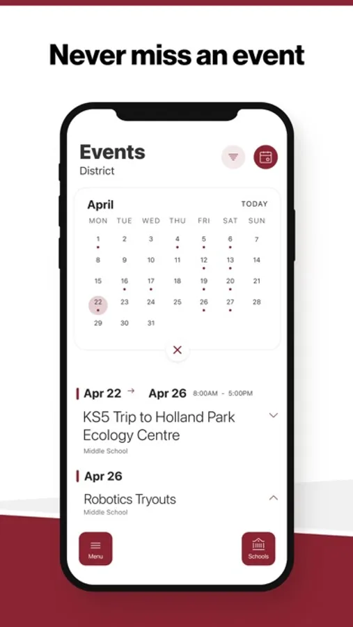 The event section shows a list of events throughout the district. Users can add an event to their calendar to share the event with friends and family with one tap.