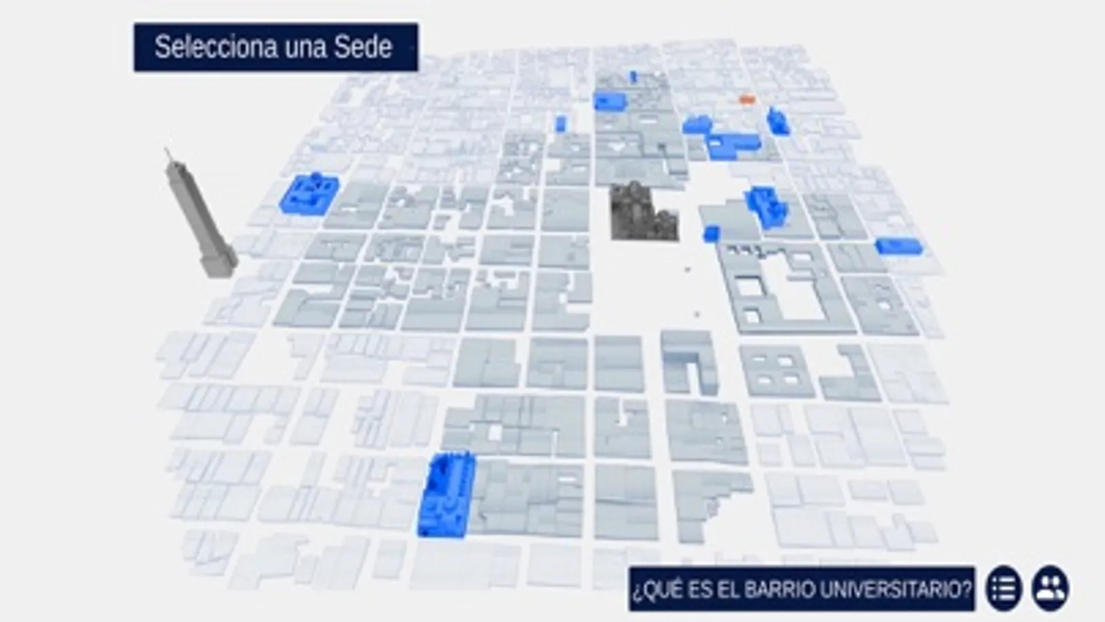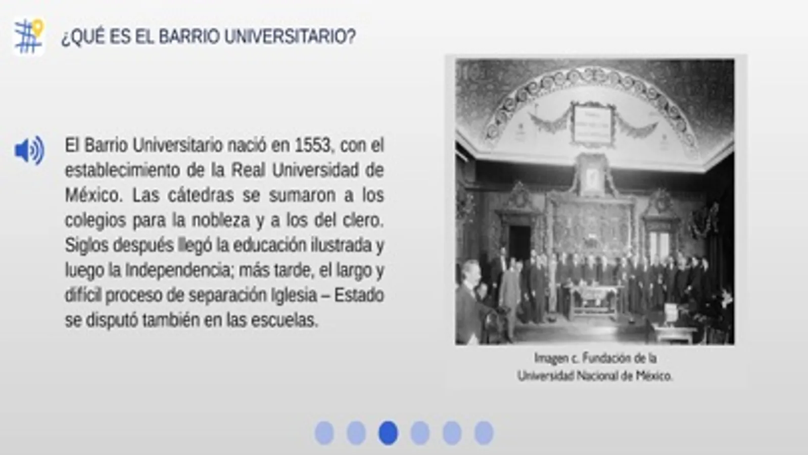 Encontrarás un mapa del Barrio Universitario en el que destacan los recintos de la UNAM, modelados en tercera dimensión y acompañados de materiales audiovisuales, especialmente fotografías del acervo del Archivo Histórico de la UNAM, videos y audios, que te ofrecen datos históricos sobre su origen, su papel en el Barrio Universitario y su quehacer actual, dedicados a la educación y la difusión cultural, tesoros patrimoniales de la Nación que la UNAM resguarda para el beneficio de todos los mexicanos.