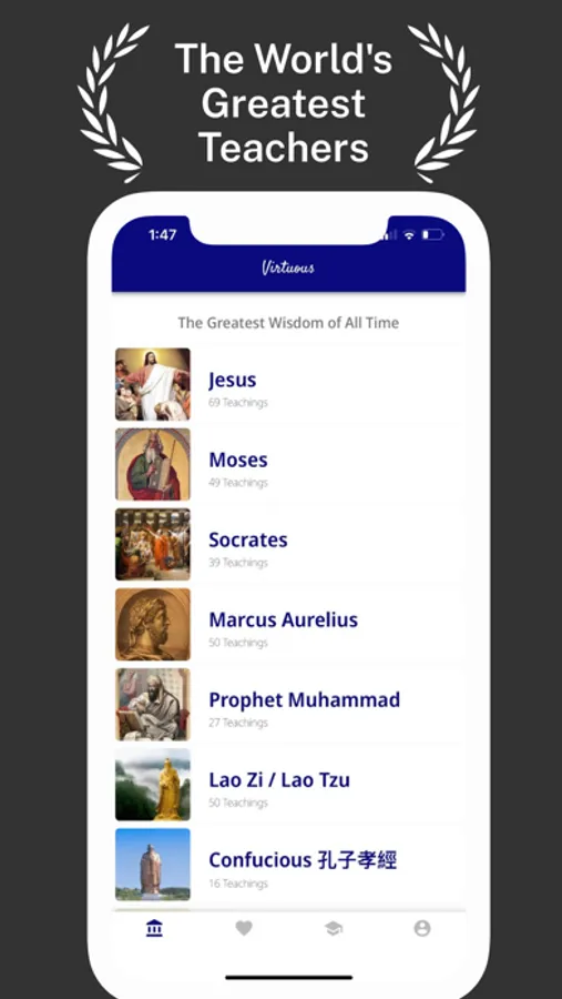 With nearly all the world's religious sacred texts at our hands, our app Virtuous delves into the essence of these original teachings from Jesus, Buddha, Socrates, Lao Zi (Lao Tzu), Prophet Muhammad, Moses, and Marcus Aurelius. Revealing the interconnectedness of the world's major religions and providing a most profound knowledge of their shared wisdom.