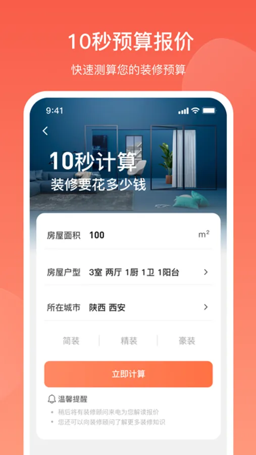 【装修预算】根据输入的房屋面积、户型快速计算出装修初步预算金额;