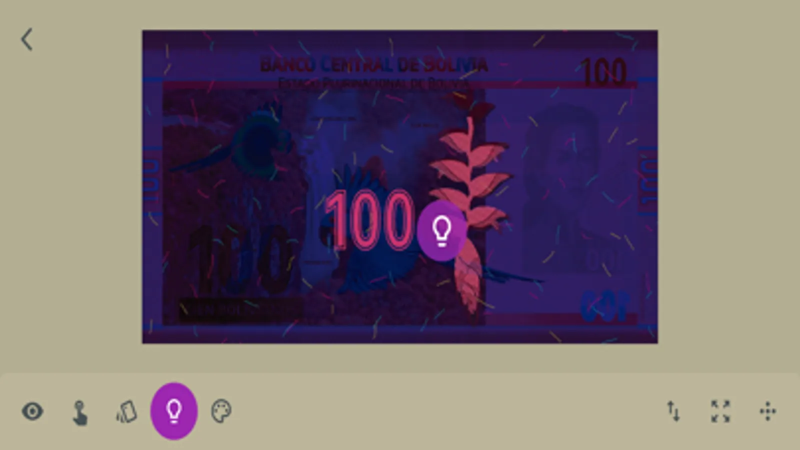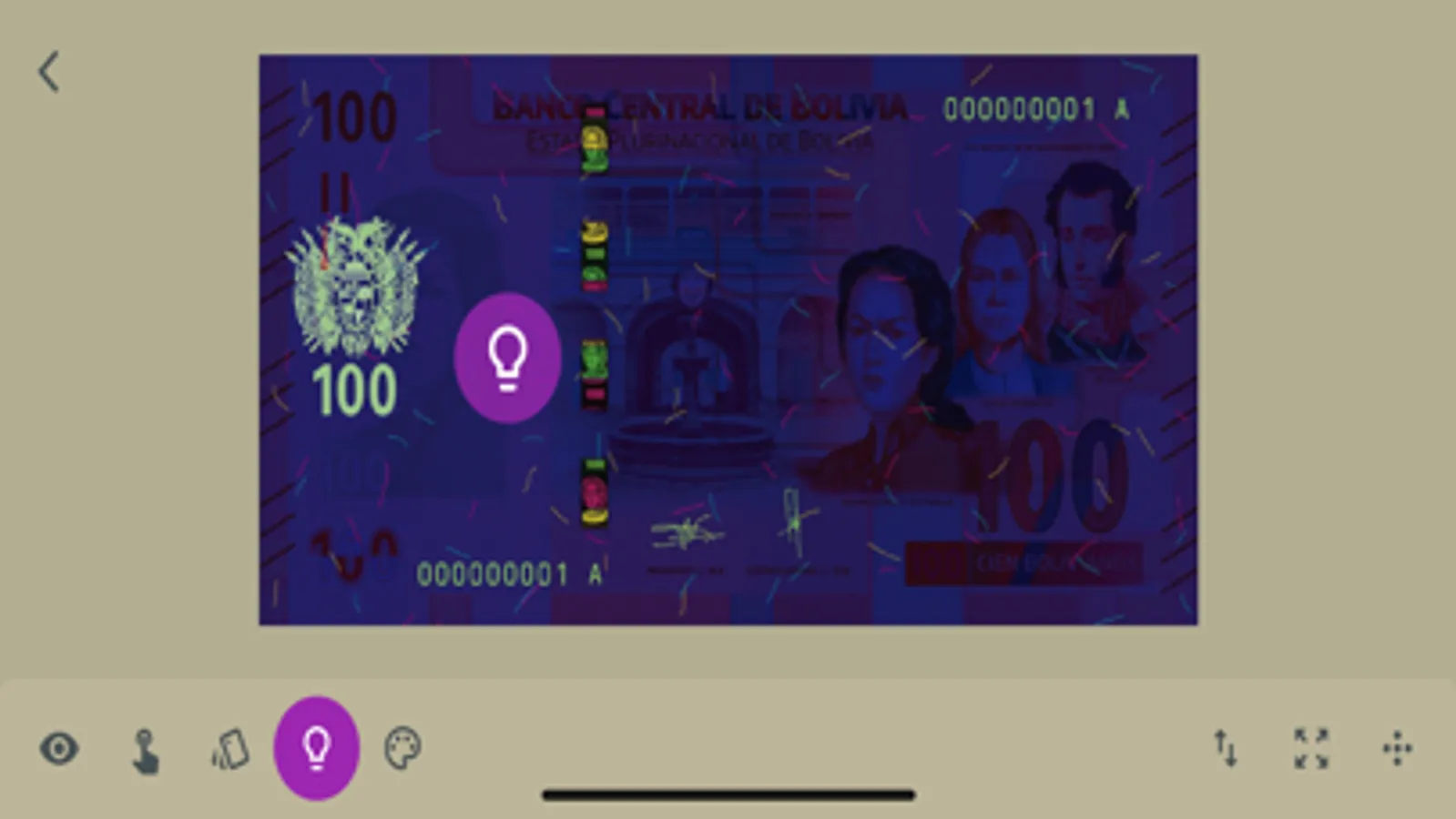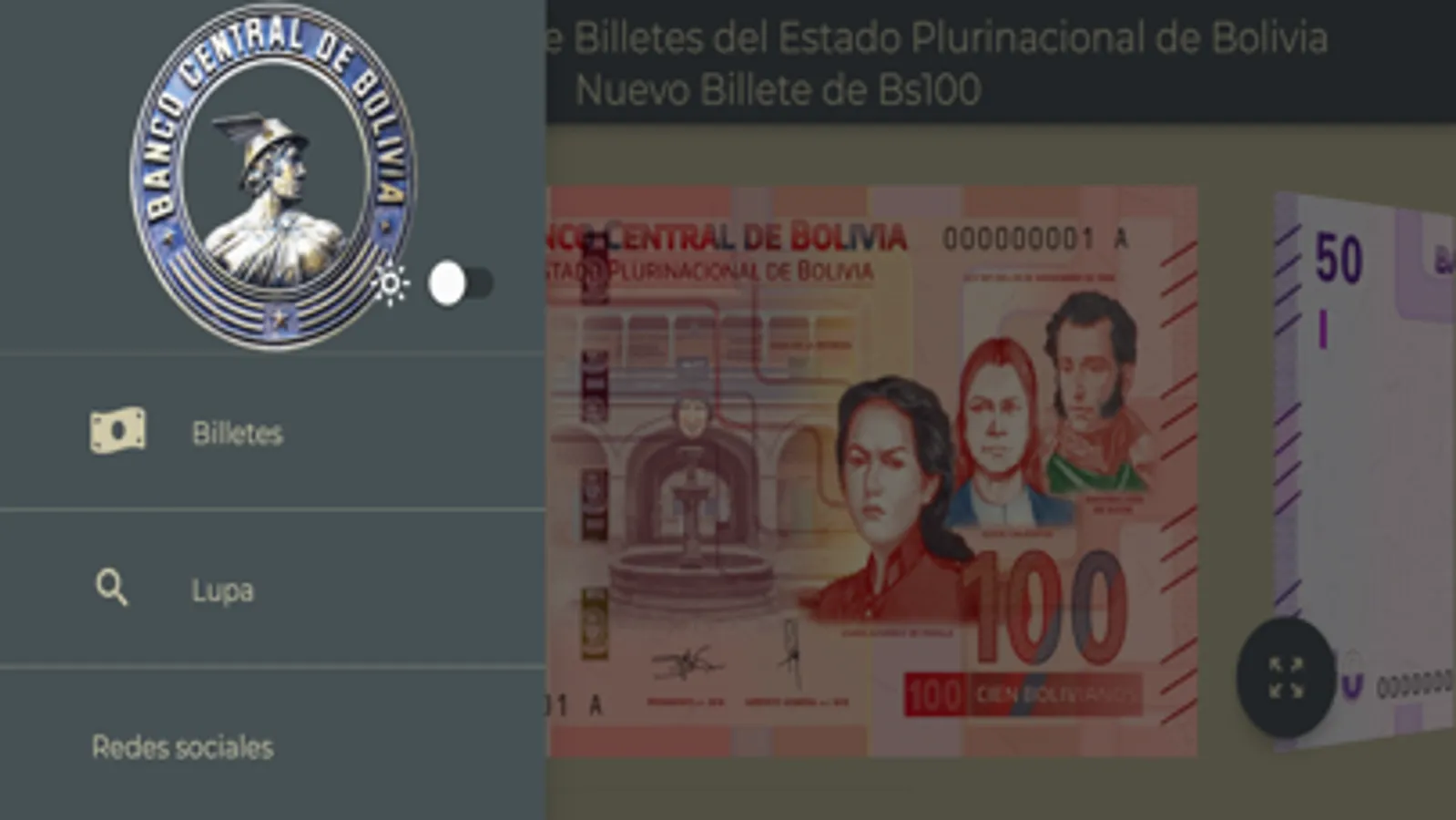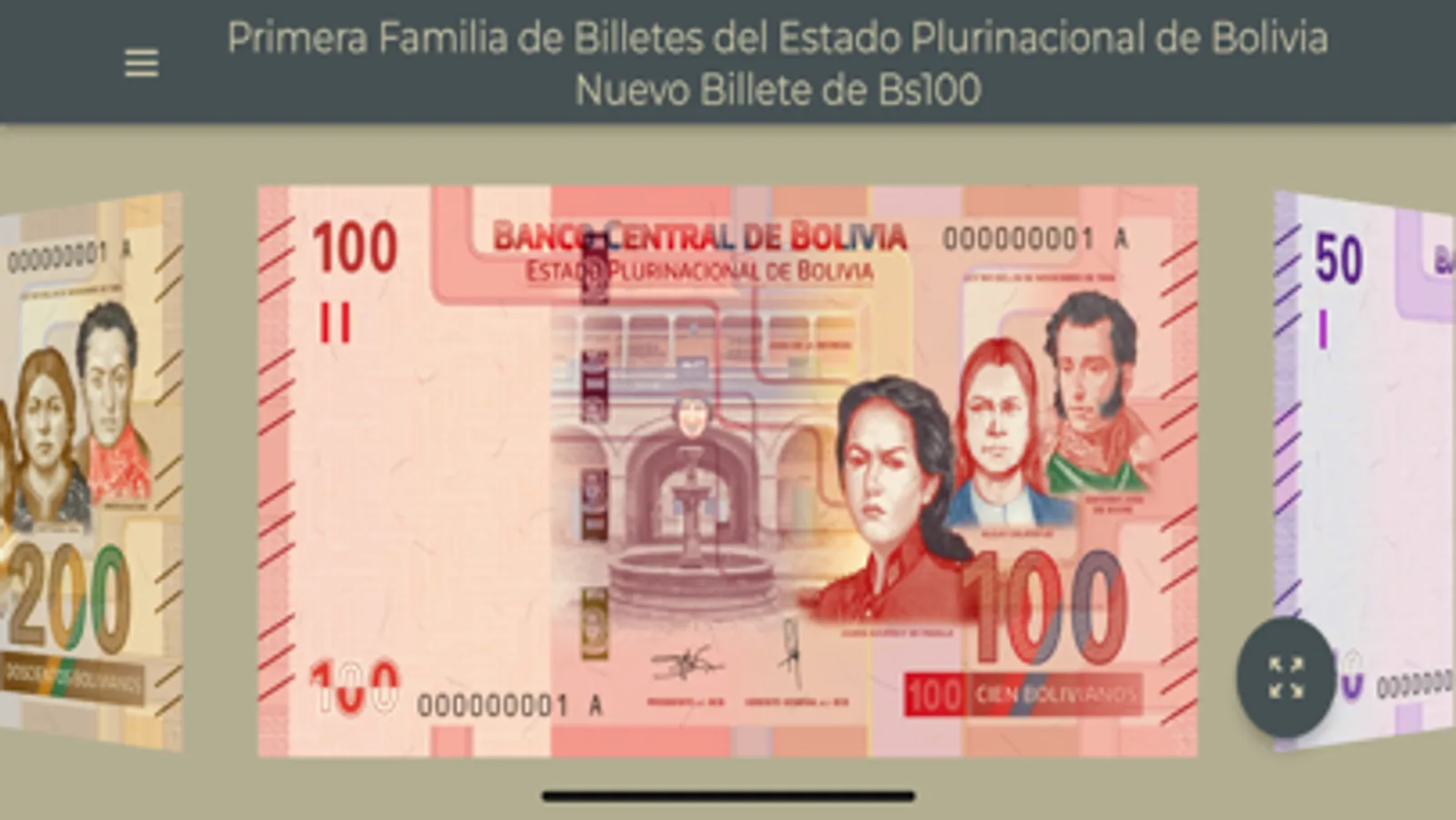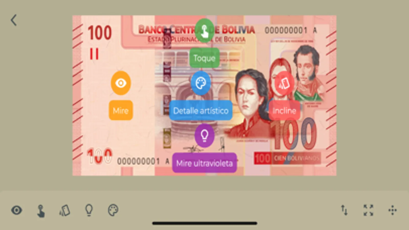 La aplicación “Billetes de Bolivia” permite conocer las medidas de seguridad de los nuevos billetes de “Boliviano”, a través de las siguientes acciones: MIRE, TOQUE e INCLINE. Dentro de cada una de estas acciones se muestran diferentes medidas de seguridad que deben ser verificadas por la población, a fin de reconocer un billete auténtico de uno falso.