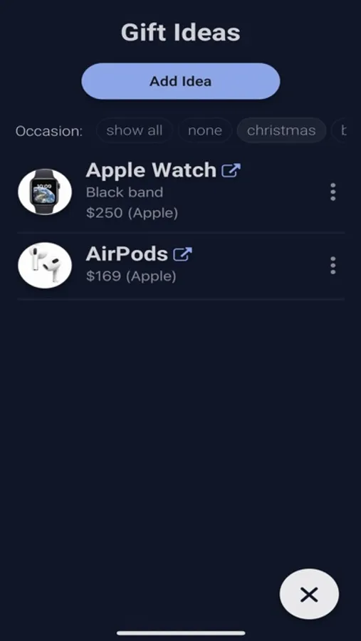 Never struggle to remember gift ideas for a loved one. Save gift ideas by occasions such as Christmas, birthday, etc.