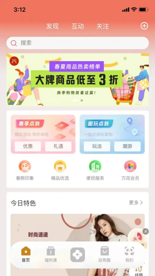 围绕成都锦江春熙路商圈的衣食住行游乐等场景的购物体验,打造的一款数字商圈购物APP 。一个集合体验、乐趣、礼遇、文化于一体的数字商圈平台,消费者在平台上领取各类商圈消费券的同时,还可体验精准推荐、AR乐趣、积分礼遇及创新社交互动等服务,将给消费者带来与众不同的商圈购物体验