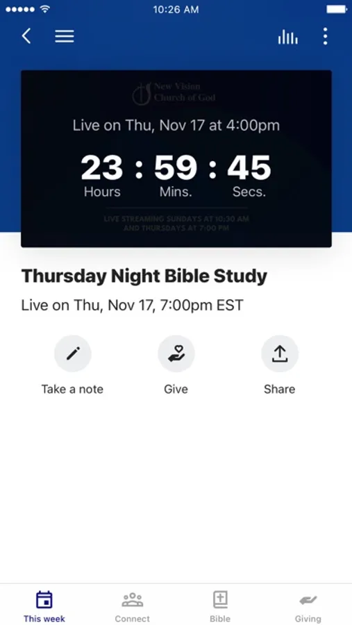 This app will help you stay connected with the day-to-day life of our church. With this app you can: watch or listen to past messages; stay up to date with push notifications; share your favorite messages via Twitter, Facebook, or email; and download messages for offline listening.