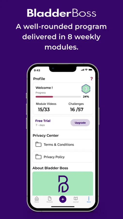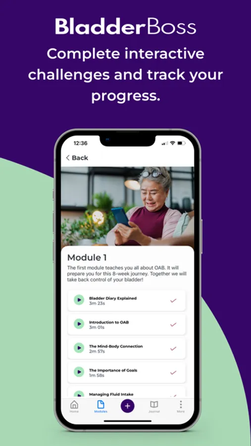 BladderBoss provides an educational and interactive eight-week program that has been developed by world-leading overactive bladder experts in physical therapy, psychology and urogynecology. The program consists of eight easy-to-follow weekly modules where you will be guided step-by-step through science-backed techniques and engaging challenges. Taking a holistic approach, BladderBoss will equip you with all the tools you need to understand Overactive Bladder, retrain your bladder, transform your behaviors, strengthen your pelvic floor and work towards personal goals - all on your own terms.