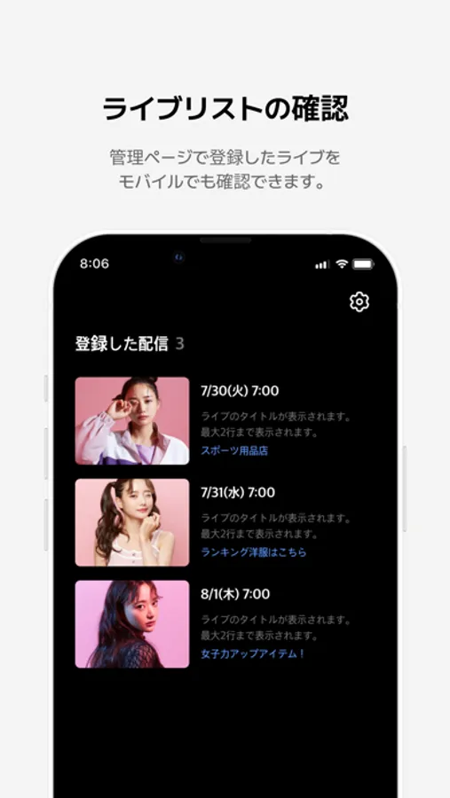 Grip cloudの管理ページで登録したライブをモバイルでも配信できます。