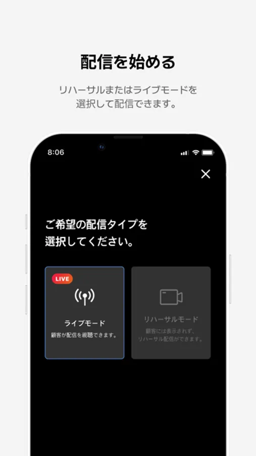ライブモード配信:ライブ配信が視聴者に公開されます。