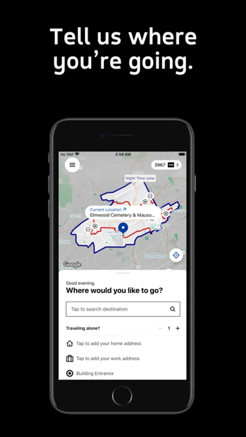 Use your phone to tell Birmingham On-Demand where you are and where you want to go. You'll receive a nearby pick-up location for a Birmingham On-Demand vehicle only a short walk away.