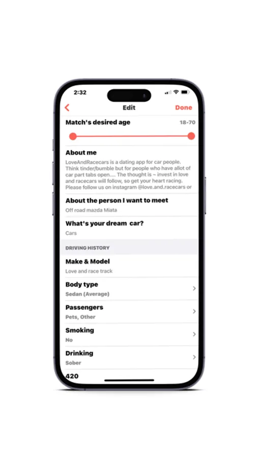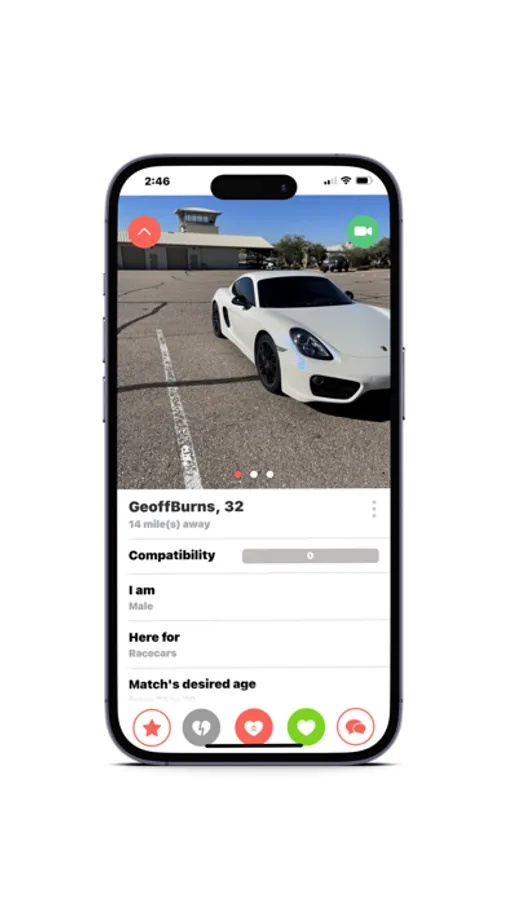This app is geared towards those that enjoy cars, love cars, and want to find someone to share that passion with. It will provide car people the opportunity to share their love for cars and meet other car people that have similar interests. It also helps those who love cars, but maybe have never met anyone like them, in hopes of matching with someone with common interests, finding friends, and love.