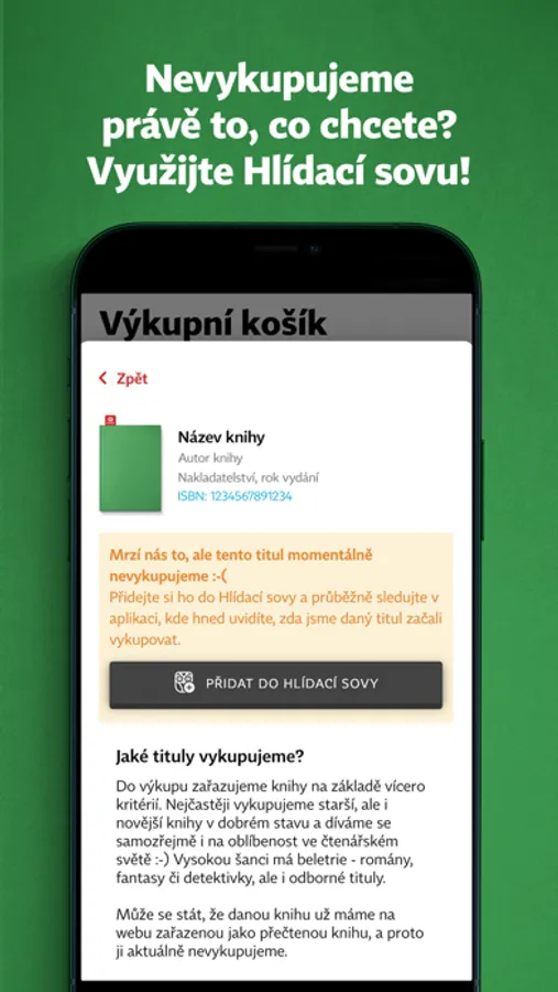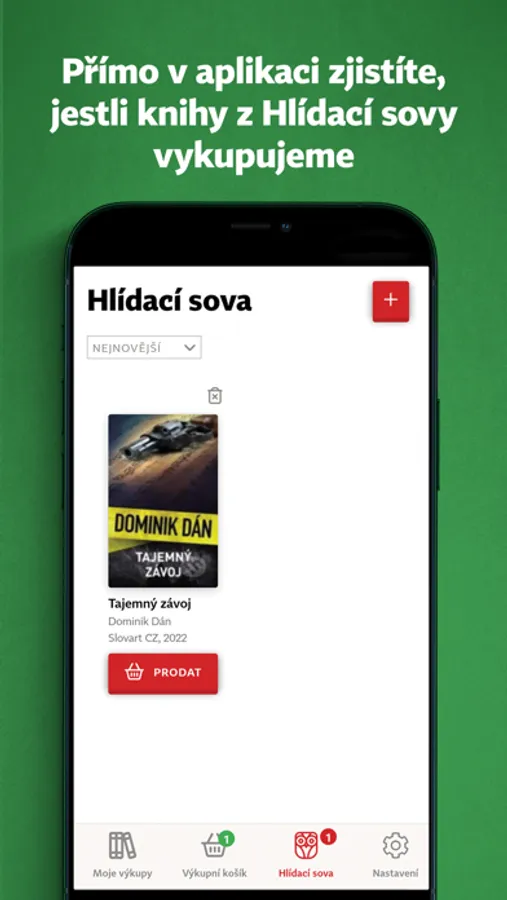 Oskenujte všechny knihy z vaší knihovny a díky funkci Hlídací sova si můžete do seznamu uložit i knihy, které právě nevykupujeme. Pokud začneme tyto knihy vykupovat, dozvíte se o tom hned po otevření aplikace a knihy můžete pohodlně přesunout do výkupního košíku.