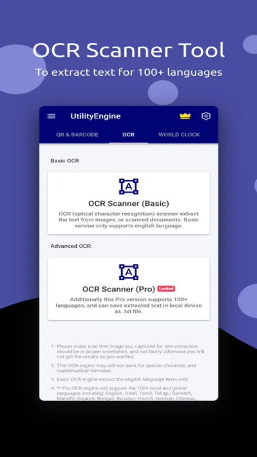 - OCR Scanner Pro which supports over 100 local and global languages (including Hindi, Tamil, Telugu, Punjabi, Gujarati, Bengali, French, simplified & traditional Chinese, Russian, etc.) to extract text from the scanned document and provide the feature of saving and export .txt file in the local device.