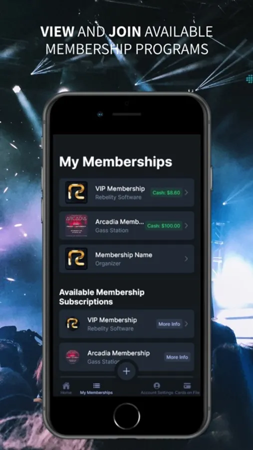 The Rebelity Membership app is for those subscribed to a membership program on the Rebelity Platform as well as festivals using Rebelity's closed loop payment system. This allows users to connect their membership NFC wearable and access member only pricing and areas. It avoids long activation lines at festivals by allowing patrons to connect their NFC enabled wristband to a payment method for use at the festival.