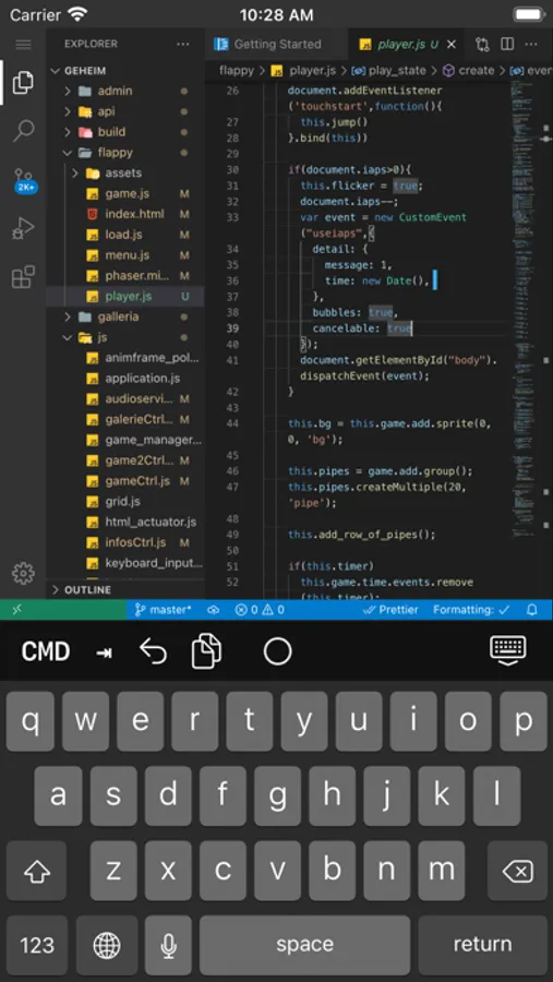 An external keyboard is recommended to use the app since selection with the touch cursor is not supported in VSCode at this moment.