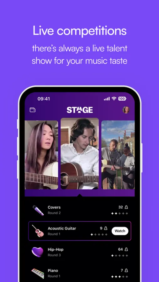 Stage combines the heart-throbbing thrill of talent competitions in the likes of American Idol or TheVoice with the dynamic, swipe-powered TikTok-like interface you love. Experience music in a way that's never been done before: compete, vote, and decide who's the next big star!
