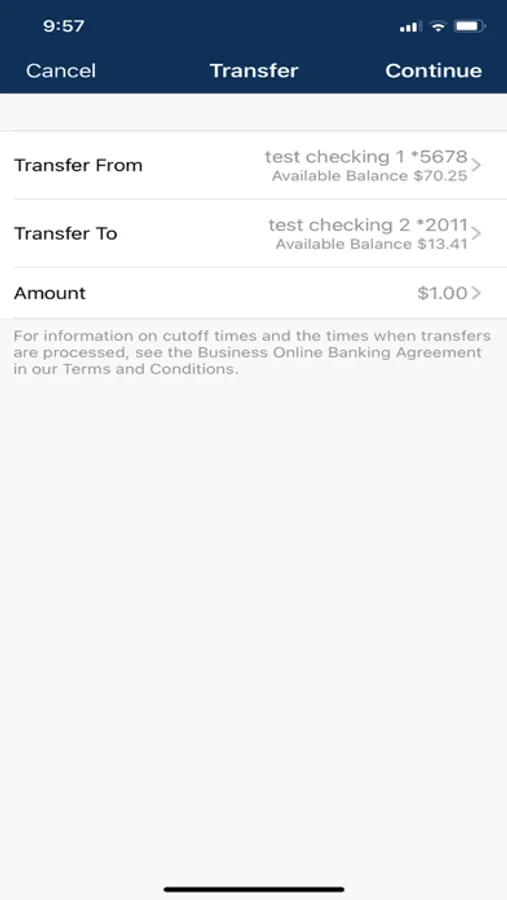 Business allows you to check balances, make transfers, pay bills, make deposits and find locations.