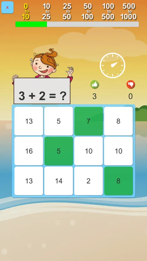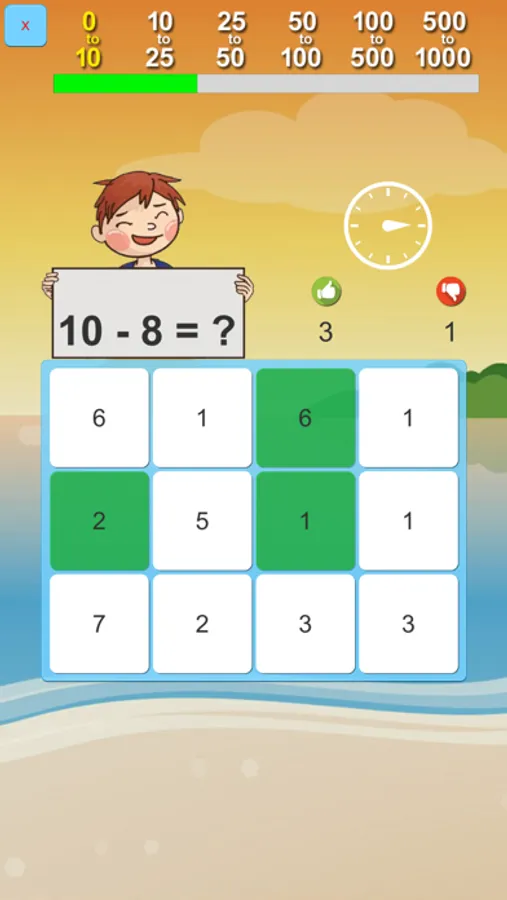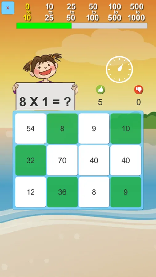 Math Exercise helps your kids to improve their math calculation. You need to give correct answer of each problem within 12 seconds. It shows how many answers were correct and wrong.