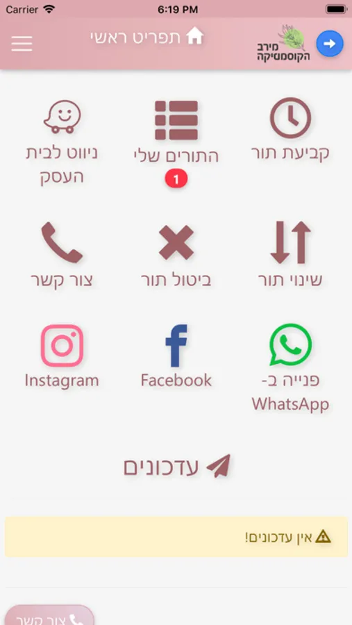 באפליקציה אפשר לקבוע תור, לנווט באמצעות Waze ולפנות אליי באמצעות WhatsApp.