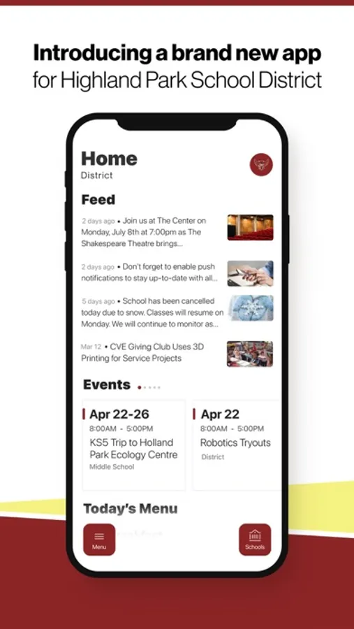 The event section shows a list of events throughout the district. Users can add an event to their calendar to share the event with friends and family with one tap.