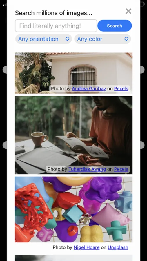 Millions of images to choose from sourced from Pexels and Unsplash. Use orientation and color presets or your own search terms to filter the image choices.