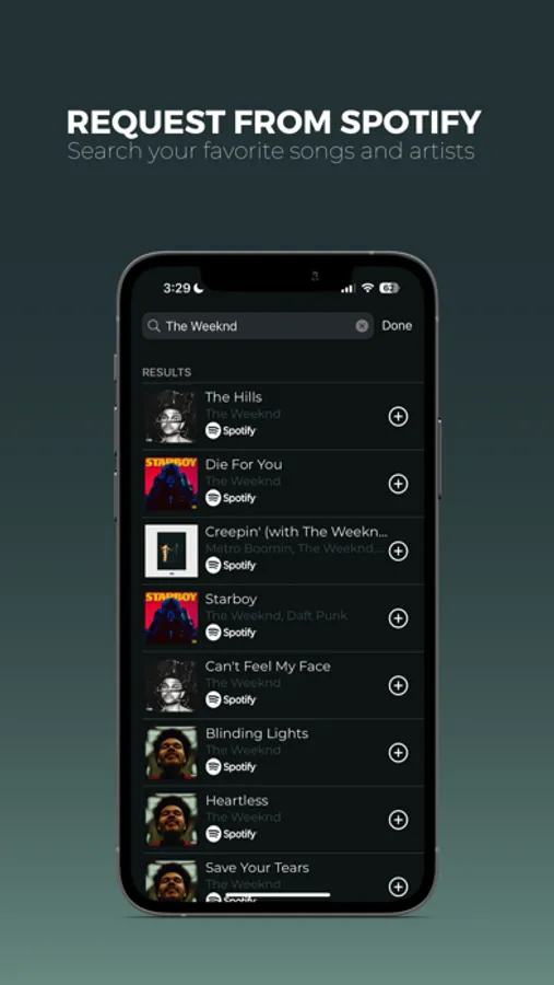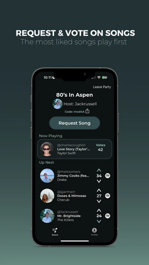 Users can select the join party option, where they will be asked to enter the unique party code which they received from the host or another attendee. Users will join the main party queue, where they can see the name of the party, the party code, the host, and what song is currently being played. They can also see what songs are in the queue and their respective vote counts, where they can vote on songs as well. By clicking the request song button, they can request their own songs directly from the Spotify library Guests can leave the party at any time they choose and are not be granted with the host capabilities such as the music audio coming from their device, and music controller features such as play, pause, skip, and volume.
