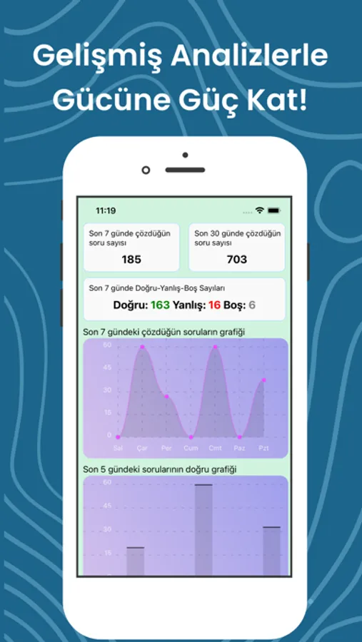 Üst tarafta yer alan son 7 günde çözdüğün soruların gün gün grafiğini gösteriyor böylelikle hangi gün tembellik yaptığını hangi gün çok çalıştığını daha iyi görebilirsin.