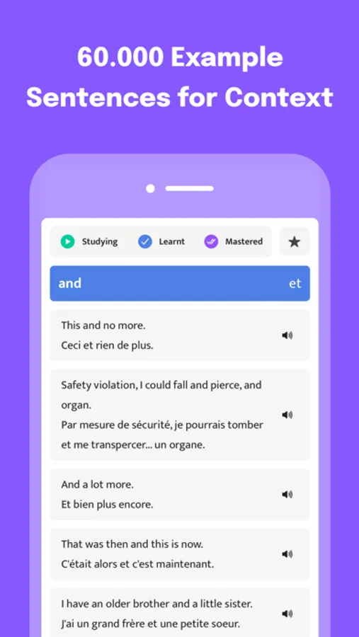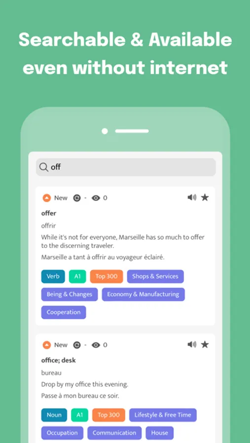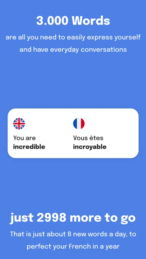 3000 words are all you need to easily express yourself and have everyday conversations in a language. This app has all the most common French ones, always available on your phone, even while offline.