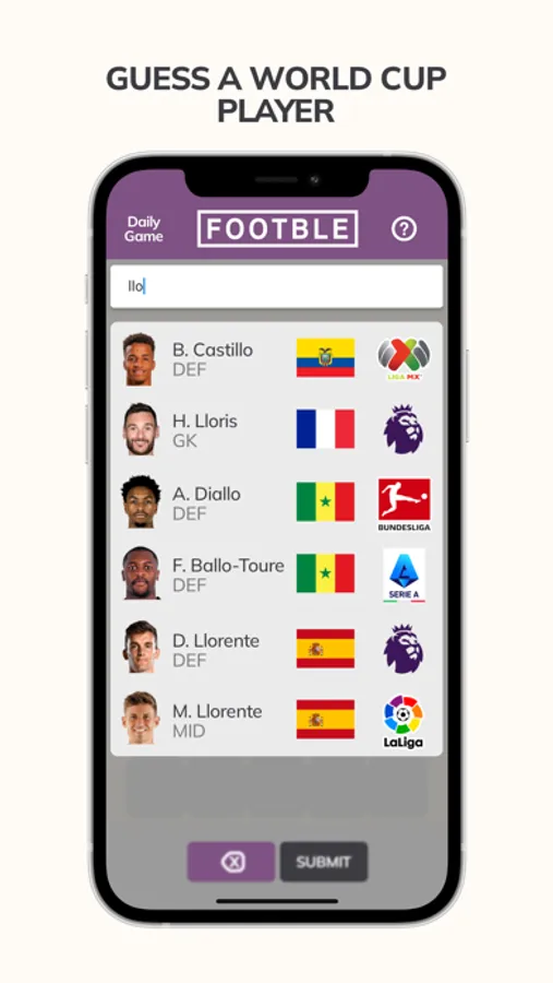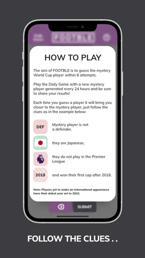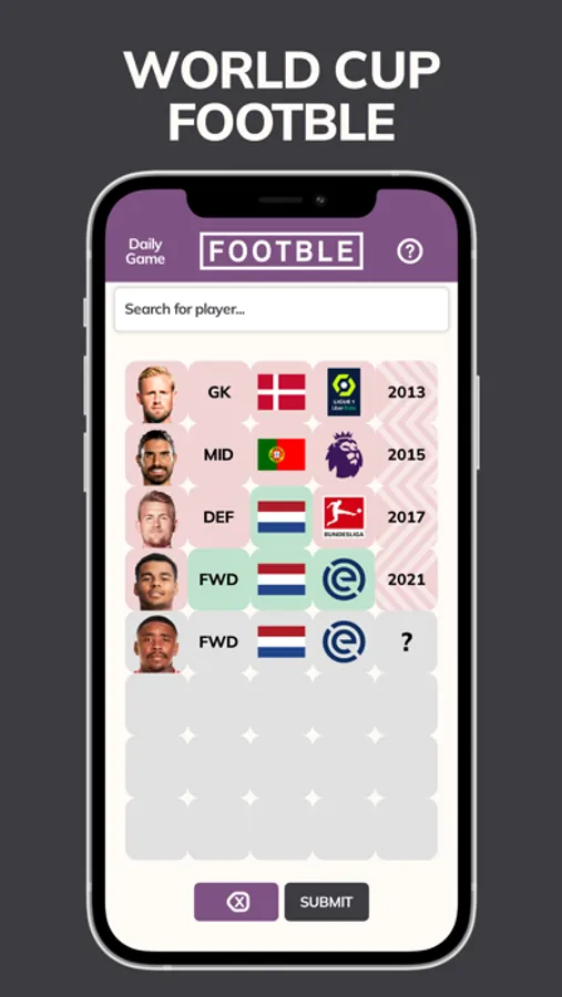 World Cup Footble is a daily puzzle in which everyone tries to reveal the Mystery Player of the day! By guessing players at this year's World Cup, you must follow the clues to bring you closer to the big reveal. You have eight attempts to see if you can unmask the Mystery Player. But be warned! If you fail to guess the Mystery Player in your eight attempts you may never know his true identity! Be sure to share your results with friends, family and online to see who can find the Mystery Player in the fewest number of guesses.