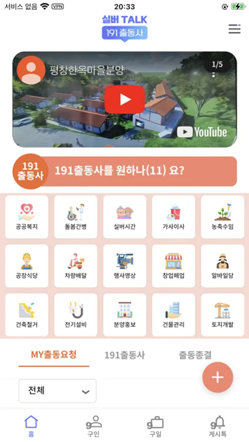 아래 출동업무를 요청한 의뢰인에게 맞춤 일꾼인 [191출동사]를 보내주는 실버기숙대학(주)의 플랫폼입니다.