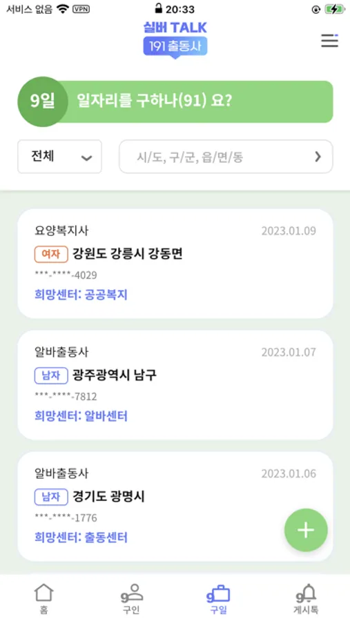 복지사, 간호사, 보호사, 간병인, 출동사의 구직활동을 위한 [9일] 등록,
