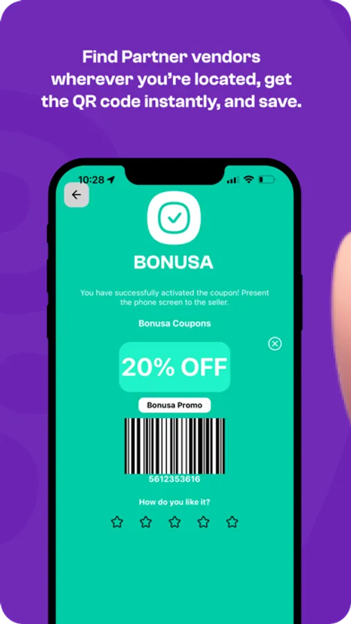 Simply open the app, enable it to find your location and see which businesses participate in offering discounts. Alternatively, look for the Bonusa sticker on a storefront as you explore a new destination or even in your hometown. Open the app, get the instant QR code and show it when you make a purchase. Save 5-25%+ instantly!