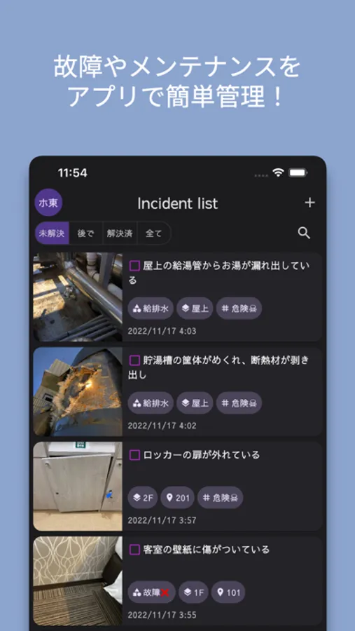 設備の故障やメンテナンスなどのインシデントの登録・管理を中心に設備管理業務を便利にする機能がつまっています!